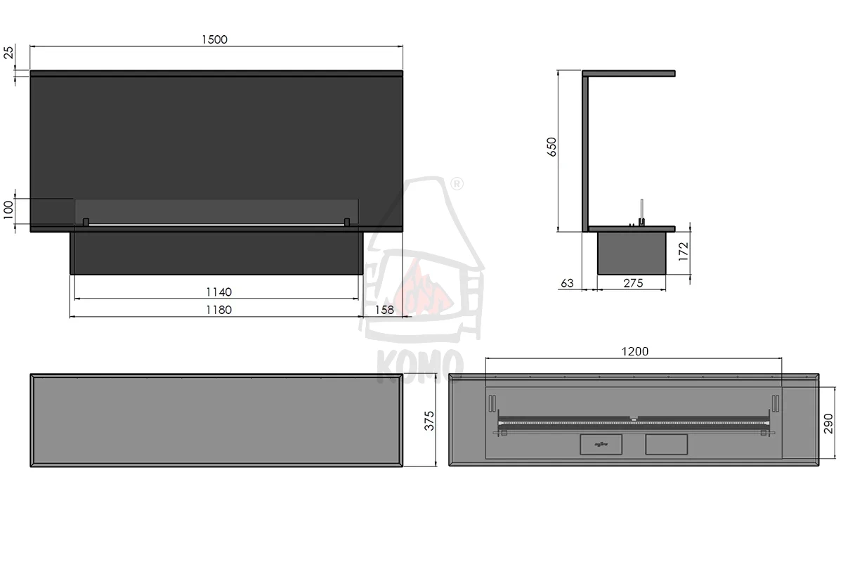 Biokominek trójstronny INFIRE ETRONIC C 1500, o wymiarach całkowitych 150×83,5×37,5 cm, jest przystosowany do zabudowy, np. w ściance działowej. Obudowa wykonana ze stali polakierowanej proszkowo na kolor czarny nie tylko upraszcza proces instalacji, ale także gwarantuje elegancki wygląd. Dodatkowym atutem jest zastosowana izolacja, która zabezpiecza powierzchnie znajdujące się wokół biokominka.