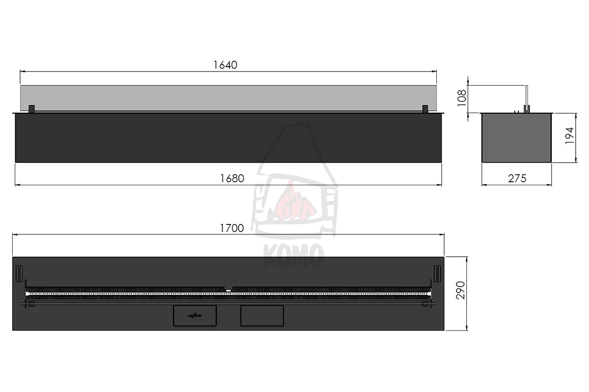 Biopalnik INFIRE ETRONIC BURNER 1700, o wymiarach 170×29×19,4 cm, został zaprojektowany z myślą o zabudowie w meblach, blatach, wyspach kuchennych i ściankach działowych. Wymagany otwór montażowy wynosi 169×28×21 cm.