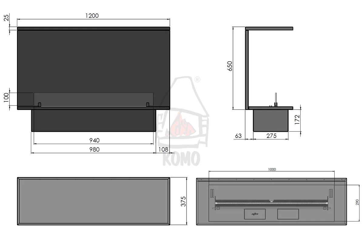 Biokominek trójstronny INFIRE ETRONIC C 1200, o wymiarach całkowitych 120×83,5×37,5 cm, jest przystosowany do zabudowy, np. w ściance działowej. Obudowa wykonana ze stali polakierowanej proszkowo na kolor czarny nie tylko upraszcza proces instalacji, ale także gwarantuje elegancki wygląd. Dodatkowym atutem jest zastosowana izolacja, która zabezpiecza powierzchnie znajdujące się wokół biokominka.