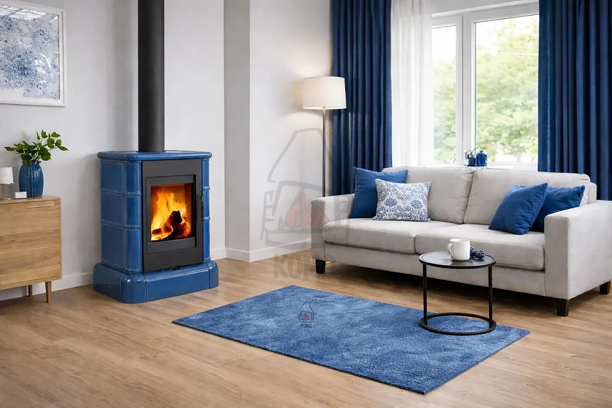 Niebieskie kafle o miękkiej, zaokrąglonej linii, czarna stal wkładu grzewczego oraz pionowa orientacja paleniska stanowią idealne połączenie tradycji z nowoczesnością.