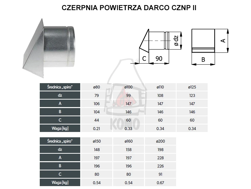 Czerpnia okrągła DARCO II CZNP-II-CH jest dostępna dla kanałów o średnicach: ø 80, 100, 110, 125, 150, 160 i 200 mm.