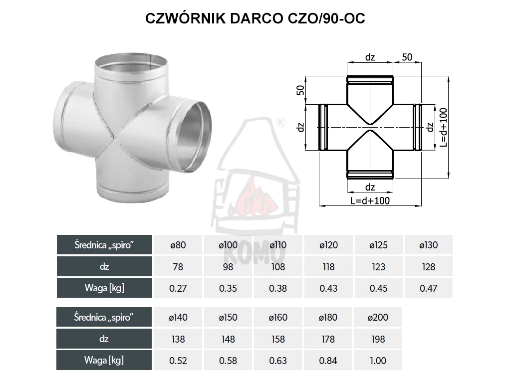 Czwórnik okrągły DARCO CZO/90-OC umożliwia przejście z kanału głównego do dwóch bocznych odnóg systemu dystrybucji gorącego powietrza lub wentylacji pod kątem 90º. Jego konstrukcja zapewnia równomierny przepływ powietrza do wszystkich gałęzi systemu.
