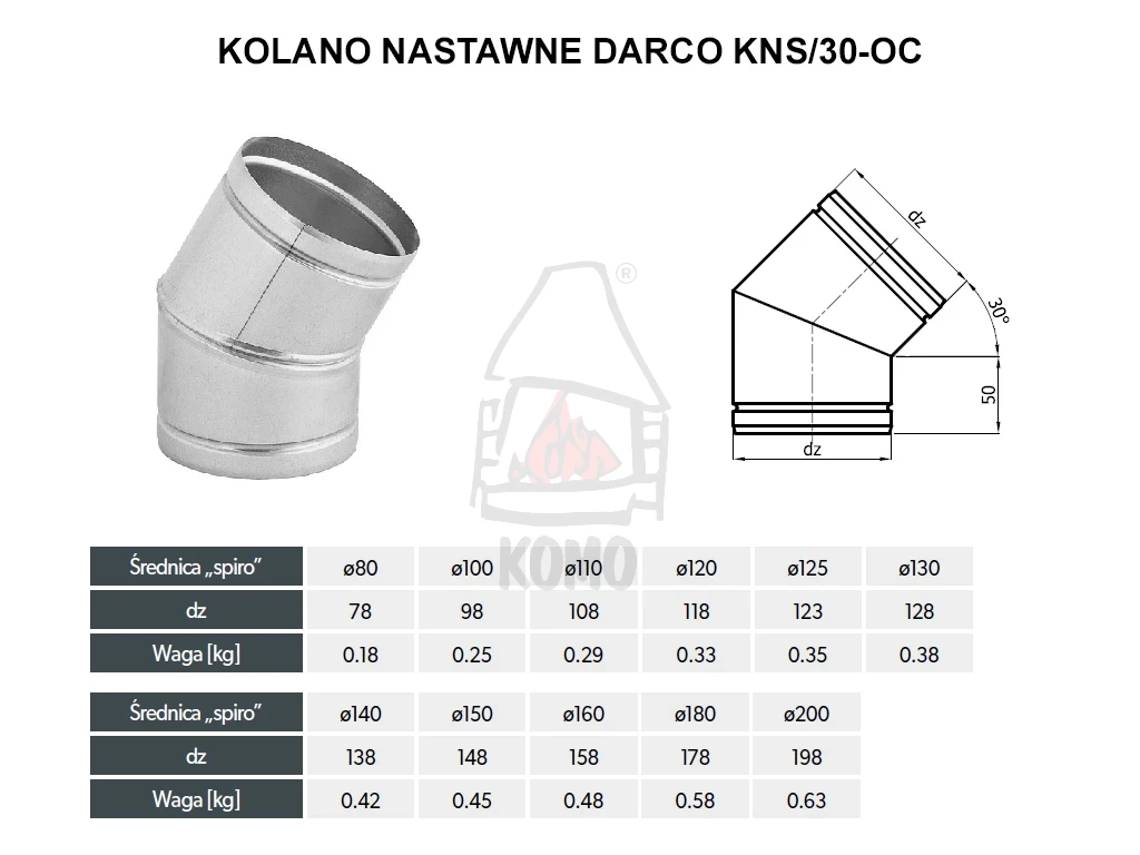 Kolano nastawne KNS/30-OC zostało wykonane z blachy ocynkowanej i jest odporne na temperaturę do 250ºC.