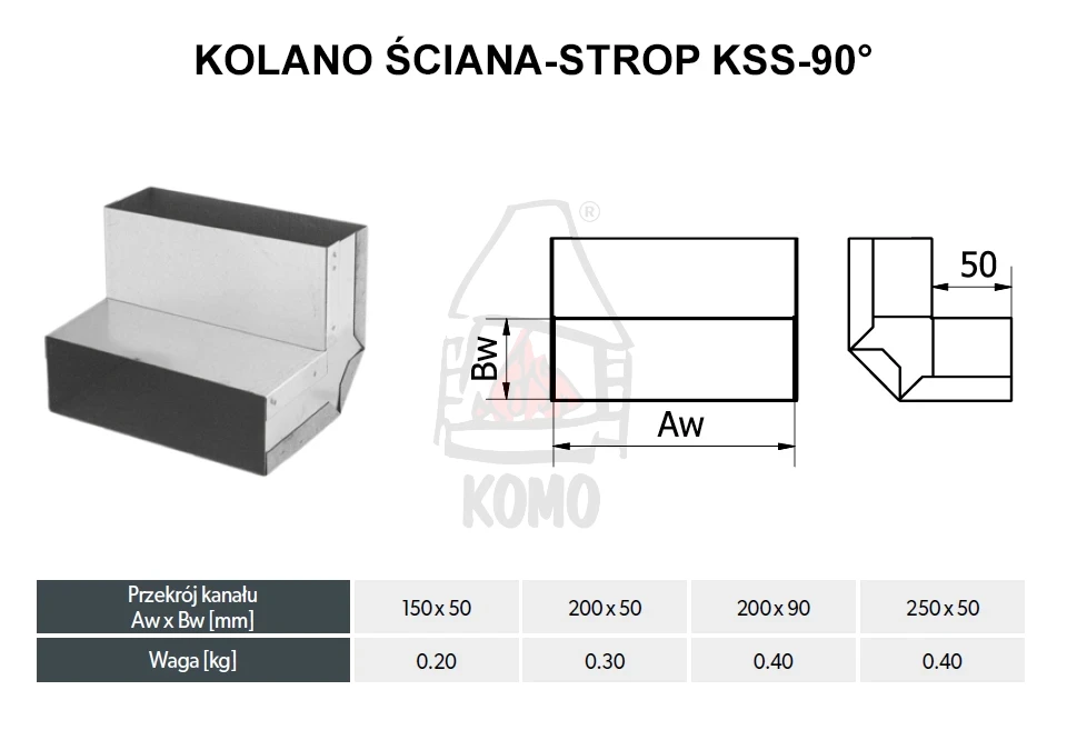 W ofercie są 4 rozmiary kolana ściana-strop KSS 90º: 150x50, 200x50, 200x90 i 250x50 mm.