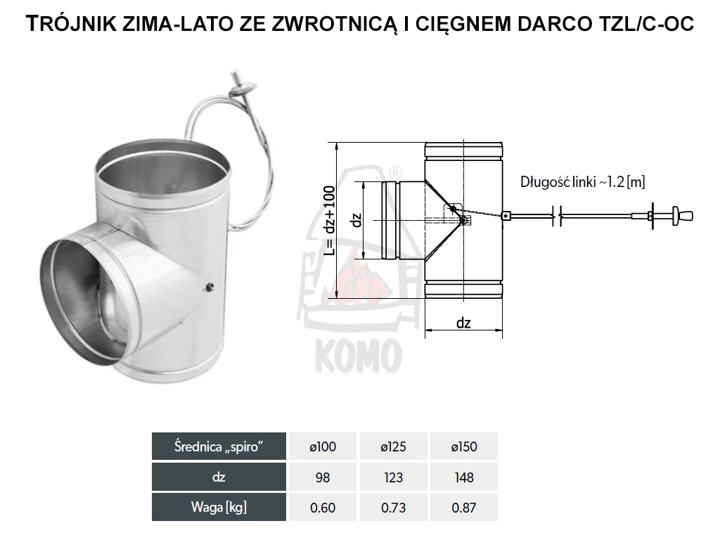 W ofercie dostępne są trójniki ze zwrotnicą i cięgnem DARCO TZL/C-OC o średnicach: ø 100, 125 i 150 mm.