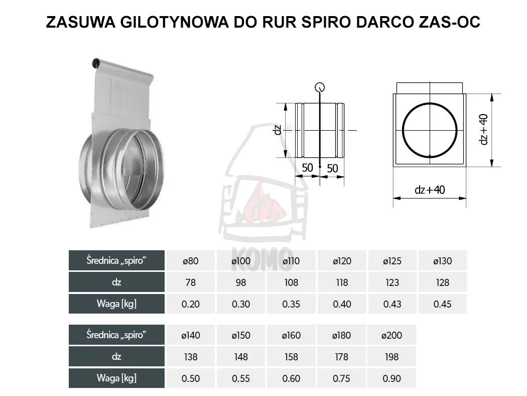 W ofercie dostępne są zasuwy ZAS-OC dla rur Spiro o średnicach: ø80, 100, 110, 120, 125, 130, 140, 150, 160, 180 i 200 mm.
