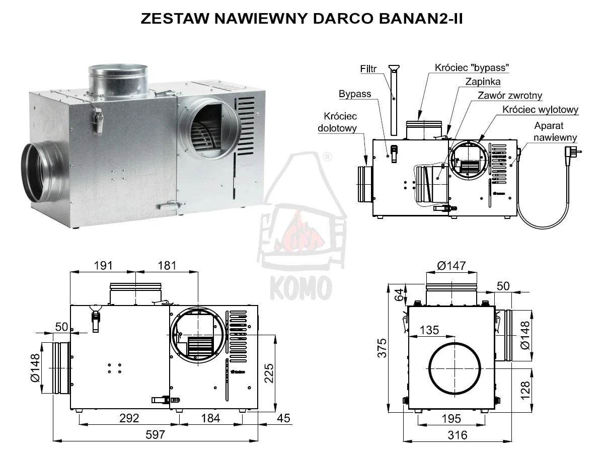 Zestaw nawiewny DARCO BANAN2–II generacji służy do rozprowadzania ciepłego powietrza z okapu nad paleniskiem kominka do pomieszczeń mieszkalnych.