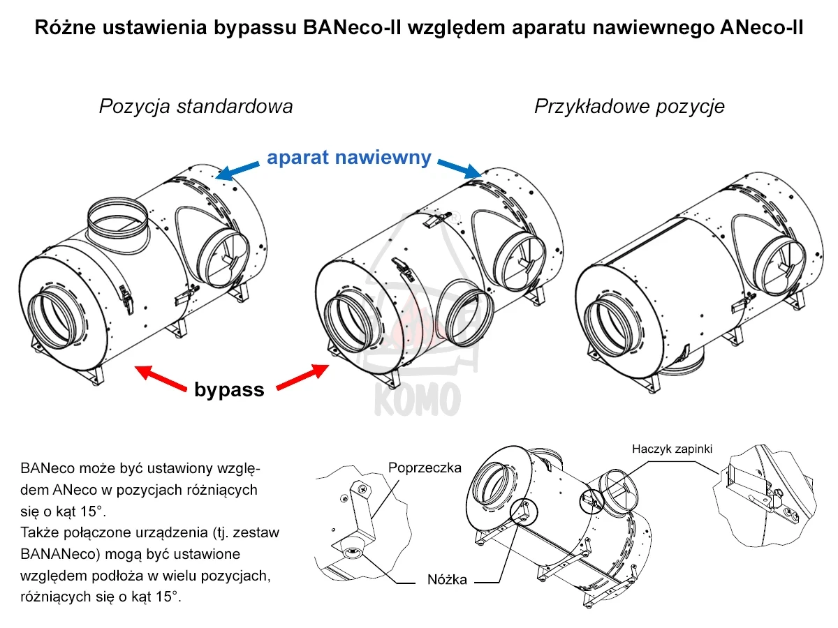 Bypass DARCO BANeco-II może być ustawiony względem aparatu nawiewnego ANeco-II w pozycjach różniących się o kąt 15° i dodatkowo cały zestaw BANANeco może być ustawiony względem podłoża w wielu pozycjach różniących się od siebie o kąt 15°.