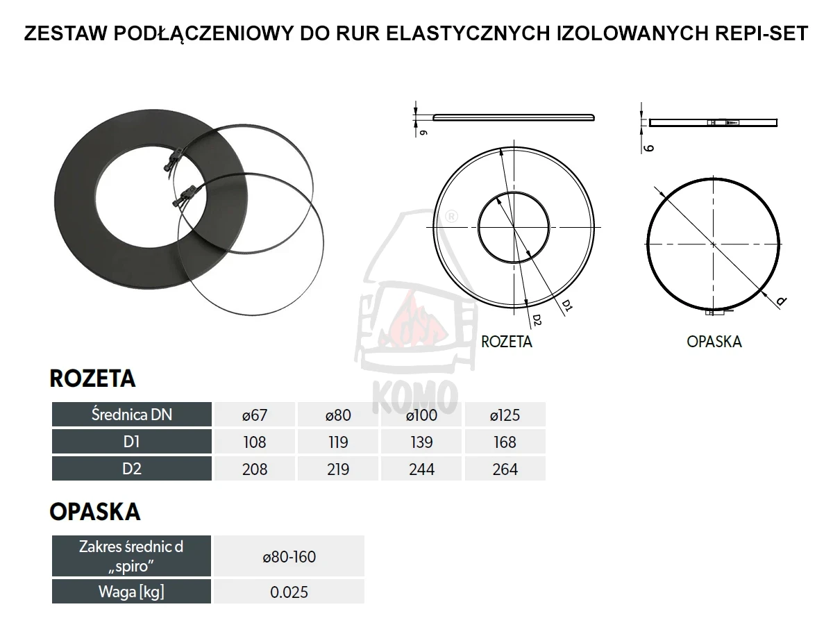 Zestaw podłączeniowy DARCO REPI-125-SET-ML-CZ służy do podłączania rur elastycznych izolowanych DARCO REPI/0,75-ML-CZ, wykorzystywanych w systemach wentylacji oraz w celu doprowadzania świeżego powietrza do wkładu kominkowego lub pieca wolnostojącego. Zestaw składa się z czarnej rozety i dwóch opasek zaciskowych.