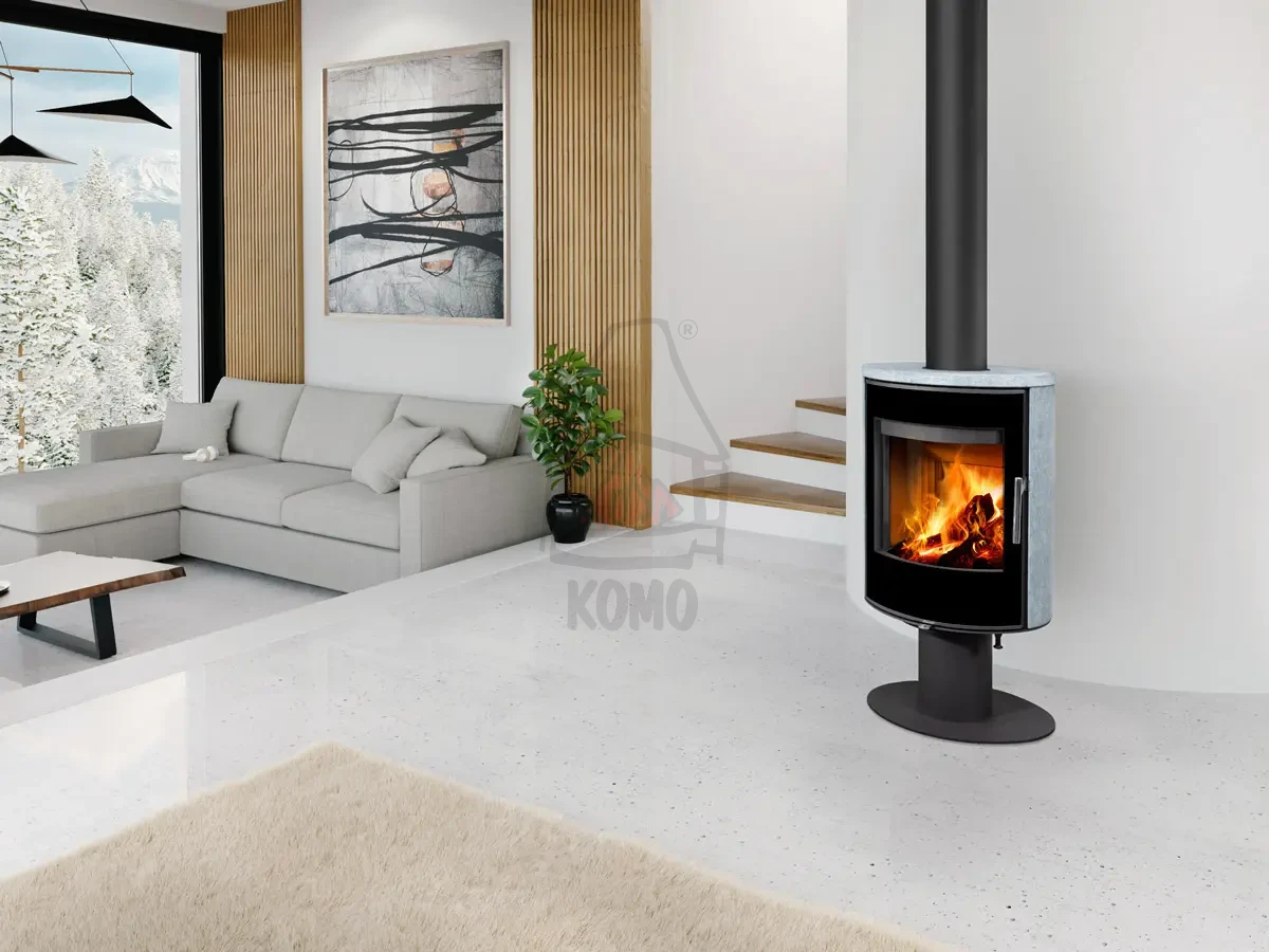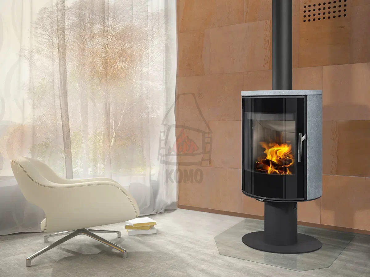 ROMOTOP LAREDO T 20 kamień to piec kominkowy o nowoczesnej sylwetce, osadzony na nodze. Korpus pieca został wykonany z kamienia naturalnego, tj. szarego steatytu.