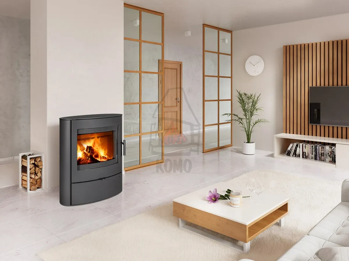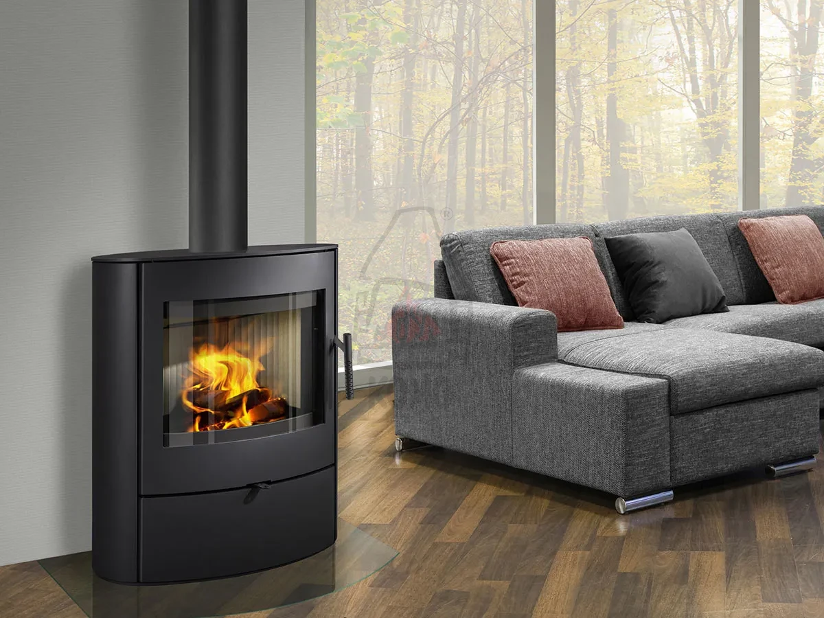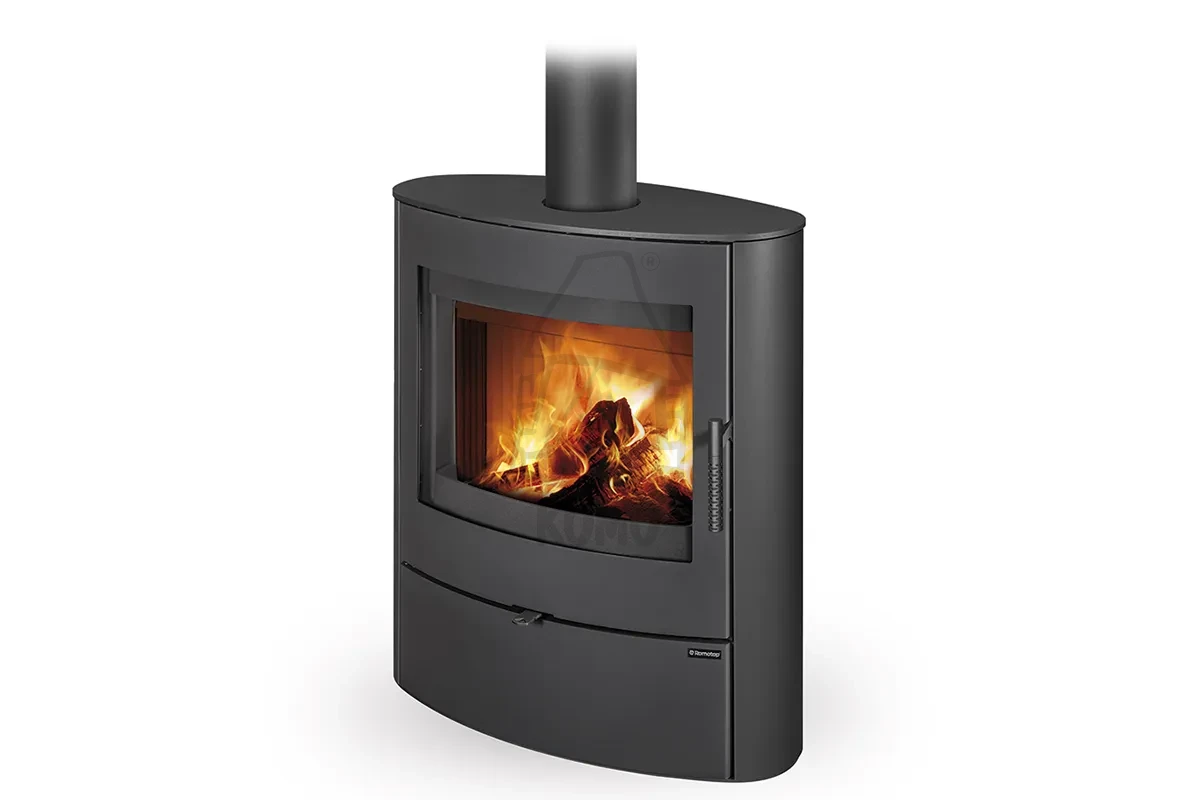 ROMOTOP NAVA 30 metal to wolnostojący piec kominkowy z szeroką wizją ognia, korpusem wykonanym w całości ze stali i szamotową okładziną wewnątrz komory spalania.