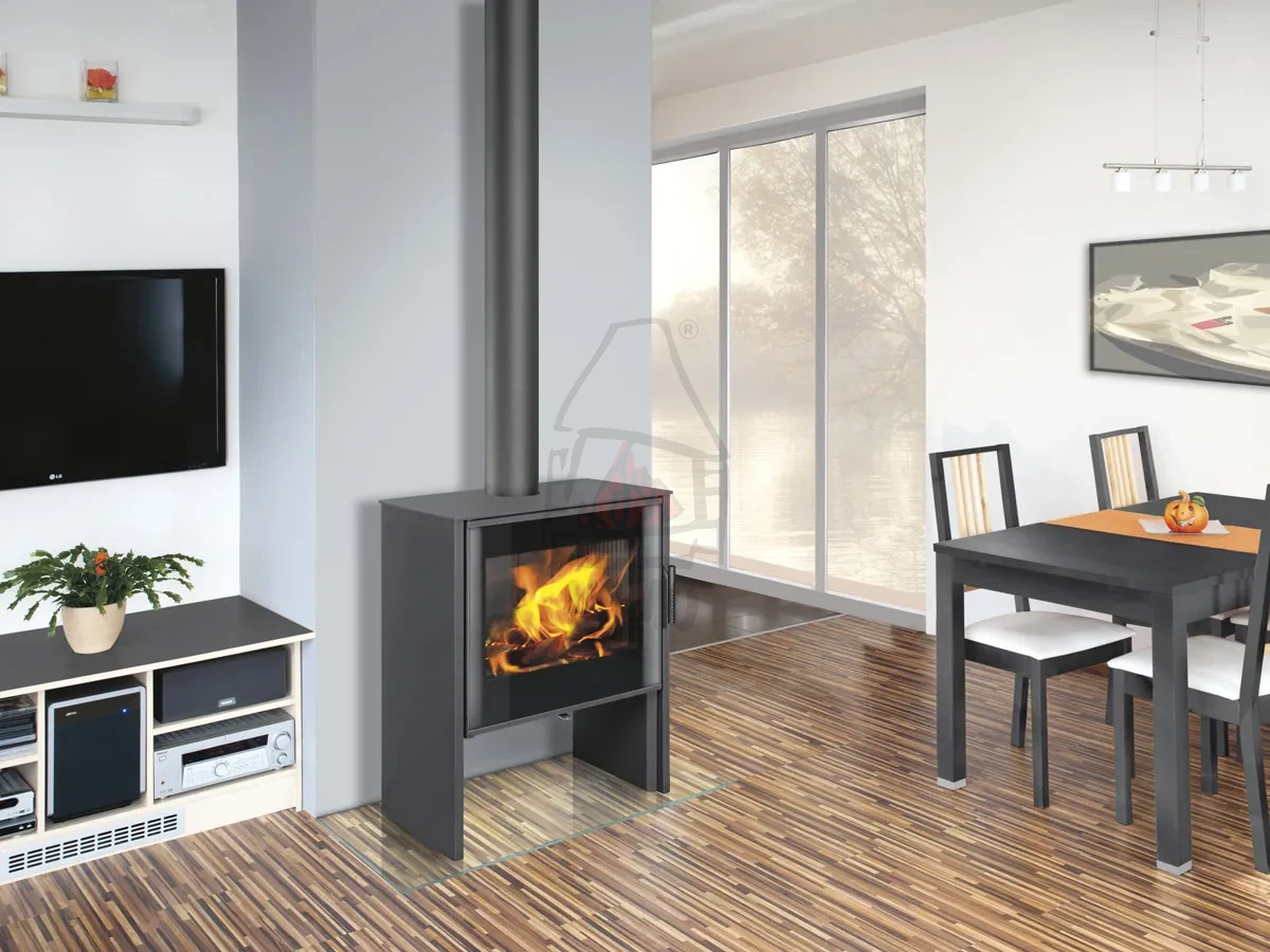 ROMOTOP RIANO G 30 metal to stalowy piec kominkowy z całkowicie przeszklonymi drzwiczkami. Czarny nadruk na szybie nadaje palenisku nowoczesny wygląd.