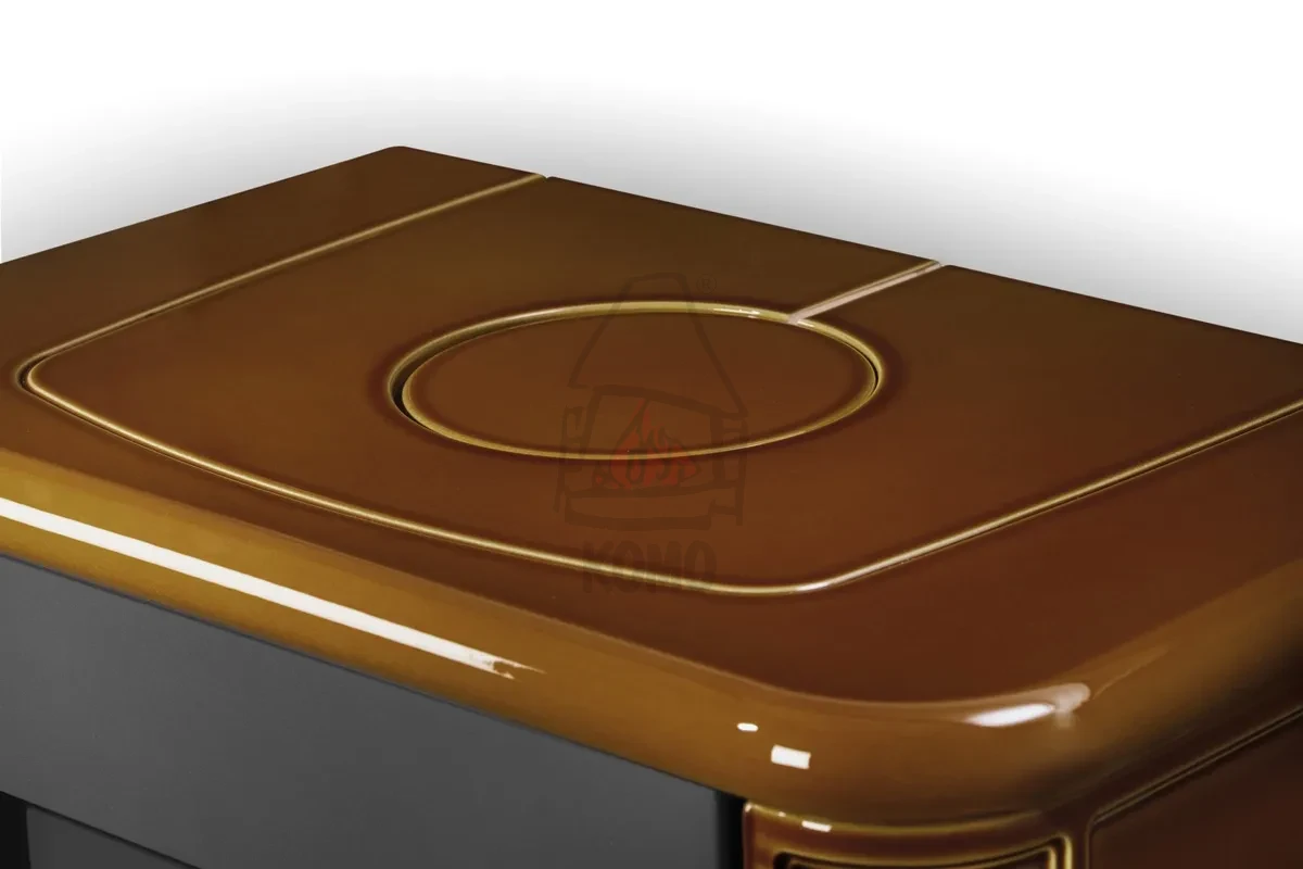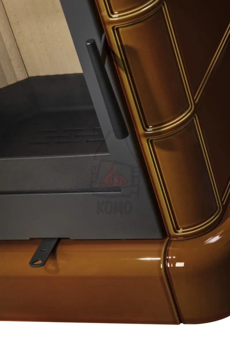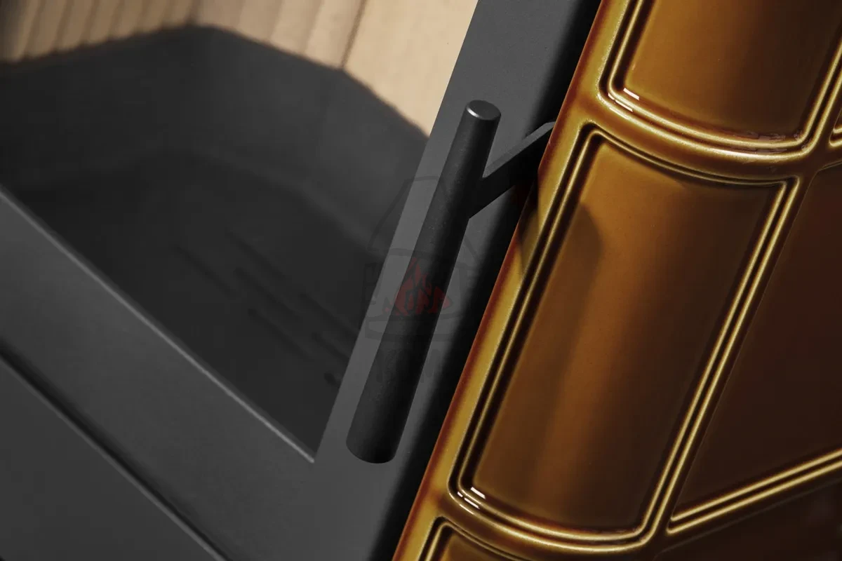 Korpus prezentowanego pieca kominkowego Romotop Siena N 01 jest obłożony kaflami ceramicznymi w kolorze brązowym z połyskiem oraz jaśniejszymi, miodowymi krawędziami (kolor nr 67300). Kafle ceramiczne posiadają właściwości akumulacyjne, które pozwalają na magazynowanie ciepła. Dzięki temu piec z ceramiczny jest przyjemnie ciepły przez długi czas po wygaszeniu ognia.