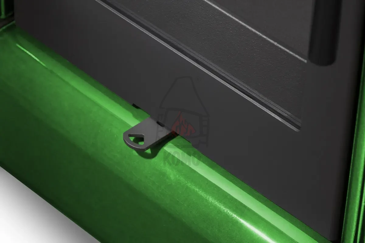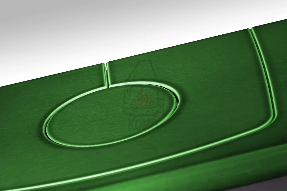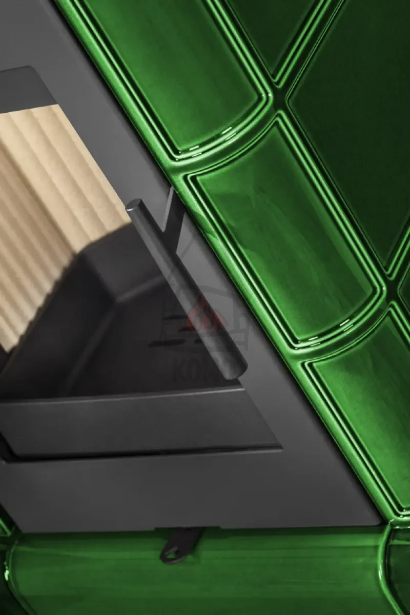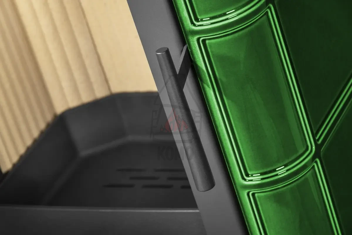 Zielone kafle o miękkiej, zaokrąglonej linii, czarna stal wkładu grzewczego oraz pionowa orientacja paleniska stanowią idealne połączenie tradycji z nowoczesnością.