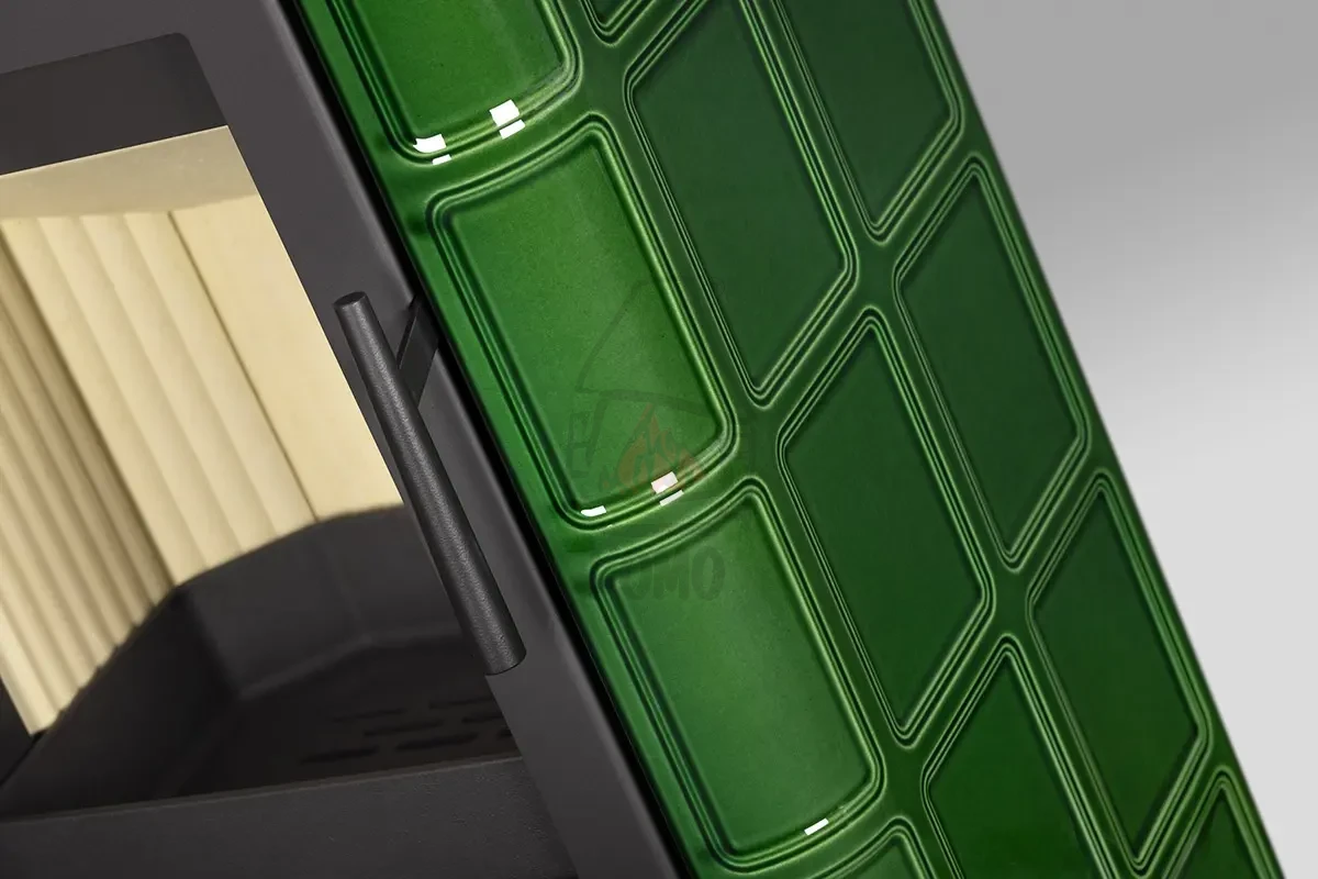 Korpus pieca kominkowego Romotop Siena N 02 jest obłożony kaflami ceramicznymi w kolorze zielonym z połyskiem oraz rozświetlonymi krawędziami (kolor nr 19301). Kafle ceramiczne posiadają właściwości akumulacyjne, które pozwalają na magazynowanie ciepła. Dzięki temu piec z ceramiczny jest przyjemnie ciepły przez długi czas po wygaszeniu ognia.