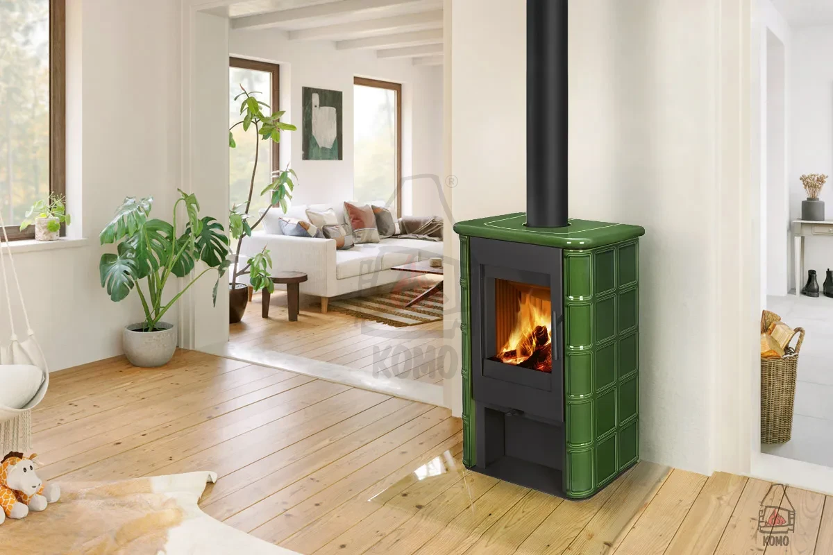 Zielone kafle o miękkiej, zaokrąglonej linii, czarna stal wkładu grzewczego oraz pionowa orientacja paleniska stanowią idealne połączenie tradycji z nowoczesnością.